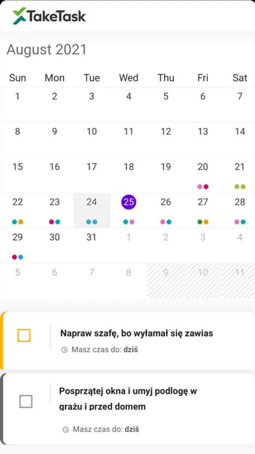 TakeTask to aplikacja do zarządzania zadaniami w postaci prostych list TODO zapisywanych lokalnie na urządzeniu oraz zaawasowanych procesów zadaniowych, checklist. Wersja darmowa, bez zakładania konta i reklam (logowanie jako gość) zawiera funkcje prostej checklisty TODO, w której możemy określić priorytet zadania, ustawić datę wykonania oraz dodać zdjęcie (na którym można rysować). Zadania przedstawione są w formie listy lub kalendarza. Jeśli chcesz poznać wszystkie możliwości TakeTask wejdź na naszą stronę WWW. Przykładowe zaawansowane zadanie możesz znaleźć w zakładce Zadania.