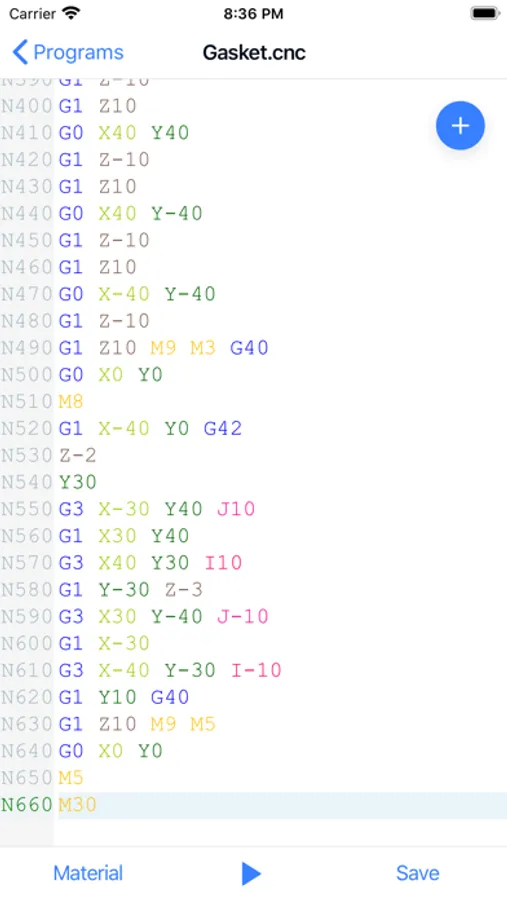 G0, G1, G2, G3, G4, G40, G41, G42, G53, G54, G55, G56, G57, G58, G59, G73, G90, G91, G94, G95, M3, M4, M5, M6, M8, M9, M30, Custom M-functions!