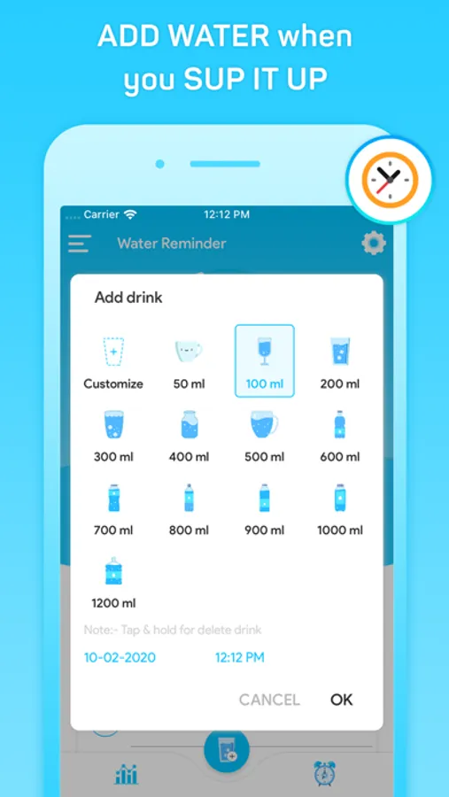 You can add the consumed quantity by using ‘+’ sign. It displays time wise water consumption per day! You can choose your desired drink quantity from the given different vessel types! You can also customize them as per your requirement!