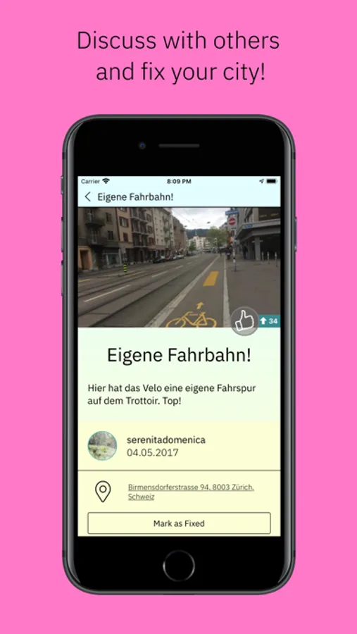 This is how it works: a user takes a photo of a place to be improved or a good example and uploads the spot with his title and comment. The spot is then displayed on the map and shown in the list. Other users can put emphasis on spots with their votes and can participate in finding solutions in the discussion. Cities, engineering companies and political interest groups as well as journalists can stay up to date about the problems and preferences of the local bike community. Small problems should be able to be fixed quickly and for the larger problems, the site serves as a digital memory so when major interventions have to be made, nothing is forgotten.