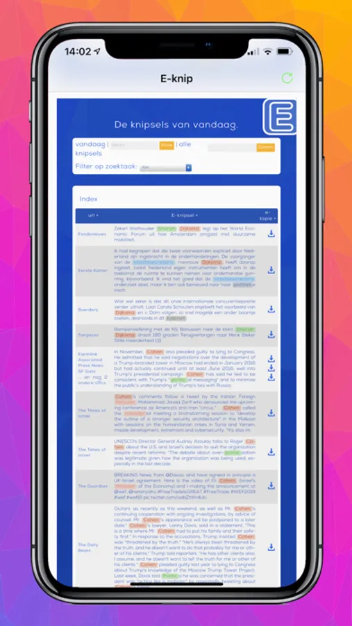 E-knip doorzoekt elke nacht ruim 4300 actieve websites op de door u gekozen zoektermen. U krijgt elke dag het nieuws van duizenden bronnen waar u in geïnteresseerd bent!