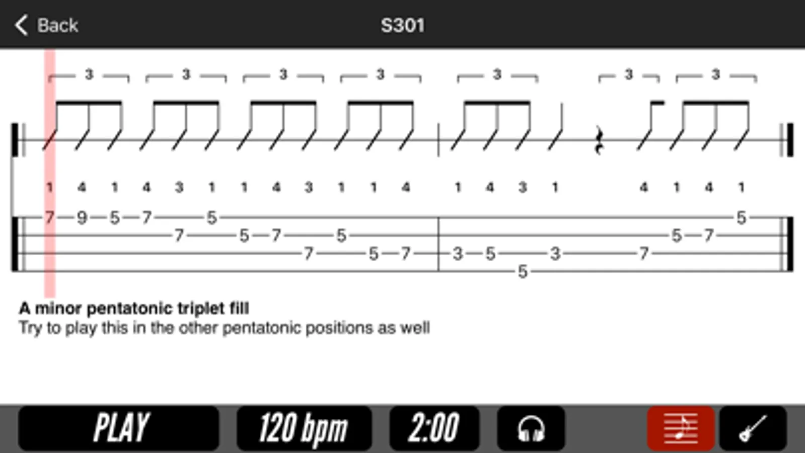 You can listen to each exercise at any speed using the app's in-built player. There is also a metronome or drum beat to help you play along at the correct speed. You can view the exercise as tab or as animated notes on a bass fretboard.