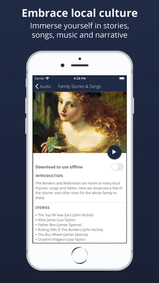 The Scotland Starts Here app connects visitors to the South of Scotland. Connecting people to places makes for a more memorable experience and helps people experience, not just observe – it is our culture! We want you to be part of who we are and what we do, we want you to feel local and immerse yourself in our destination. Let us bring it alive.
