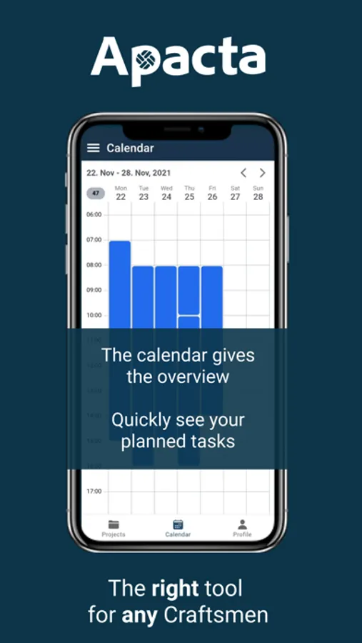 The day-to-day task will be the same - just easier and more efficient. With Apacta, you have all the information you need to manage and grow your business. The app will become your reliable companion on the worksite for all registration, while the Apacta web application “Control Panel” lets you control the finances, offers, invoicing, export of data and more.