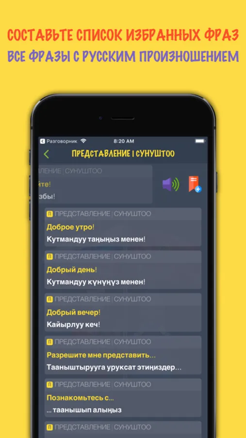 Разговорник также поможет вам в изучении и усовершенствовании языка: фразы возможно сохранять в разделе «Закладки» для быстрого доступа и дальнейшей практики произношения.