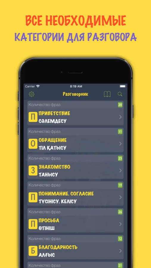 Разговорник - отличный помощник для тех, кто знает русский/казахский, и незаменимый спутник для всех, кто только приступает к изучению языка. Разговорник полностью работает без подключения интернета.