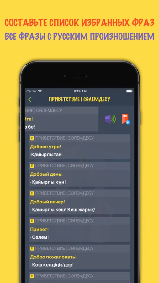 Разговорник также поможет вам в изучении и усовершенствовании языка: фразы возможно сохранять в разделе «Закладки» для быстрого доступа и дальнейшей практики произношения.