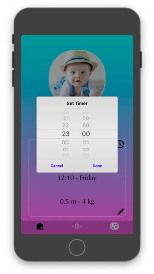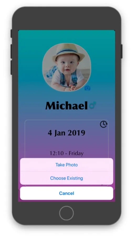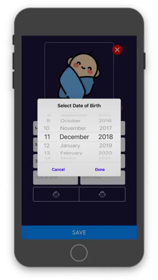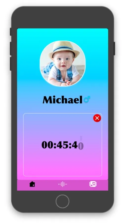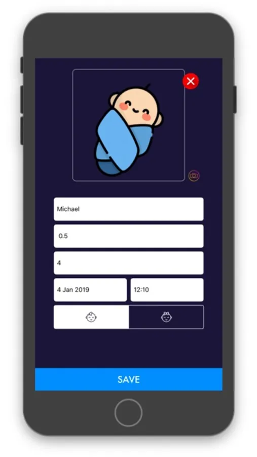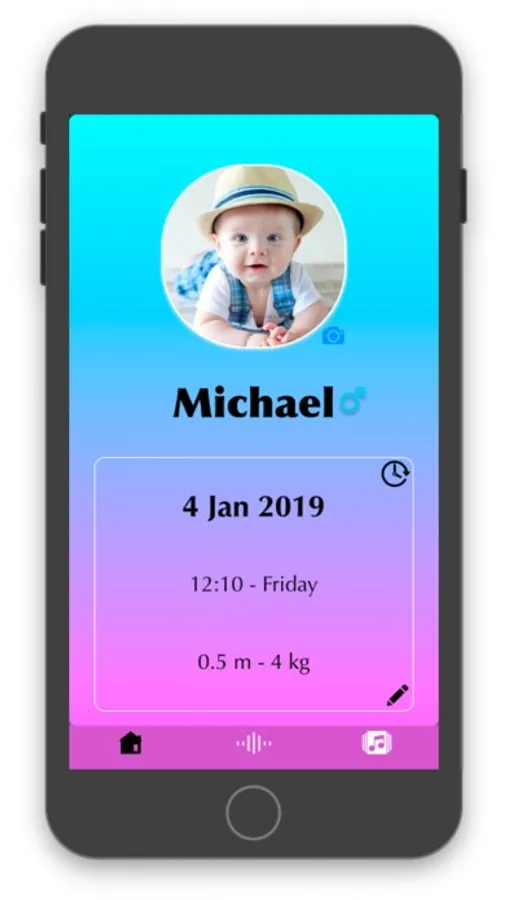 • In the first menu, you can see your baby's information. Here you can add and see your baby’s name, date of birth, day and time.