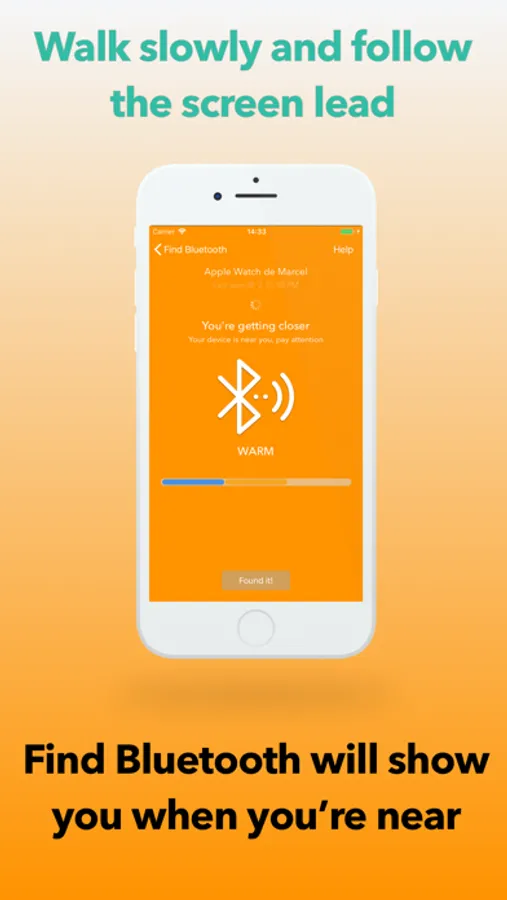 3) Walk around slowly following the screen lead. The app’s screen will turn from blue to orange to red as you get closer to the lost device.