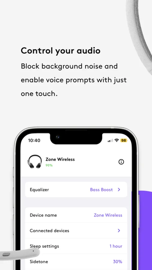 Meet Tune, the visual control center that revolutionizes your Logitech Wireless Headset experience. Tune offers additional features that let you go beyond manual controls and fine-tune everything from Sidetone to EQ. With Tune, you can get visual confirmation of your mute, ANC, and sound settings, and control everything through one convenient dashboard on your smartphone.
