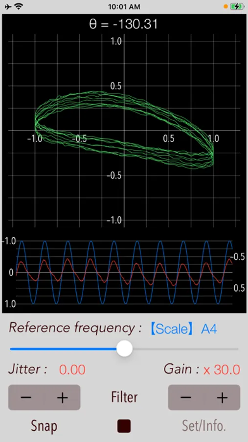 - Enabling the noise filter may reduce the level of the input signal extremely. Adjust the input level to make it easy to see the amplitude of Lissajous.