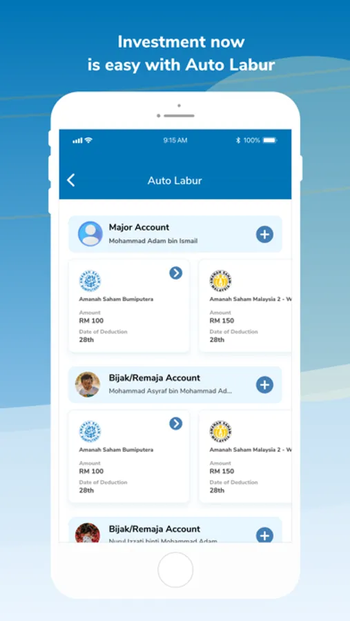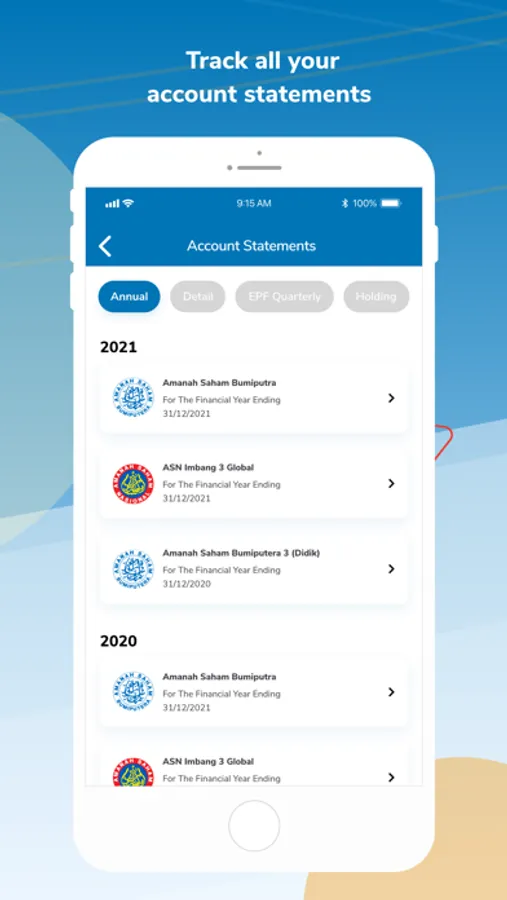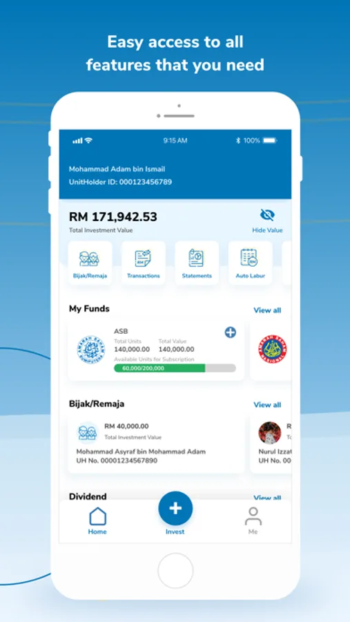 The myASNB Mobile App is the official mobile app by Amanah Saham Nasional Berhad, a wholly-owned subsidiary of Permodalan Nasional Berhad that allows its users to safely and conveniently view their ASNB investment portfolio and perform additional investments on their mobile/tablet from anywhere, anytime.
