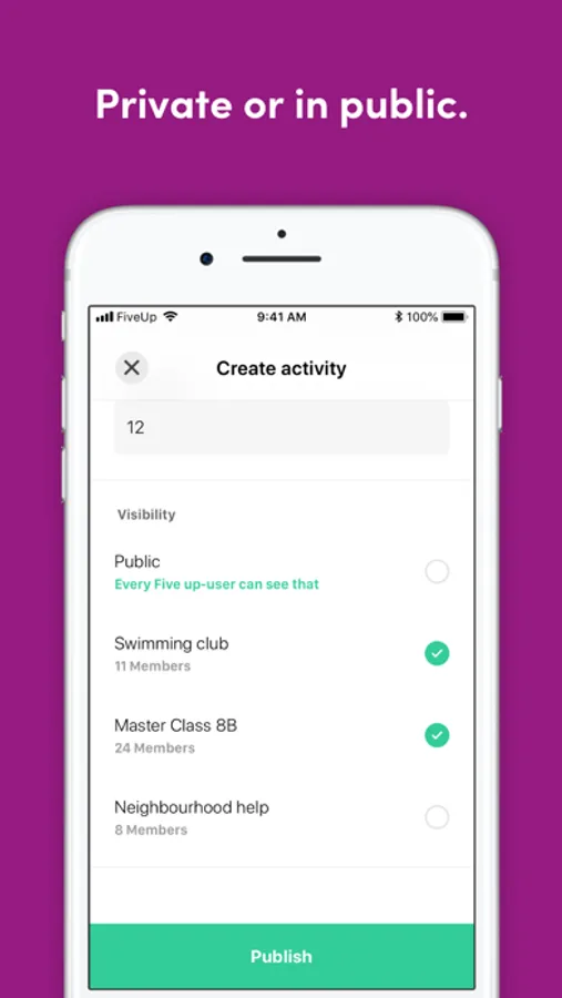 Push messages inform the people in your network when there is a new need – a helping hand is found in an instant. In this way, everyone stays up to date and in touch with each other. Being it at home, in your club or at work - with «Five up» organizing support becomes easier than ever before.