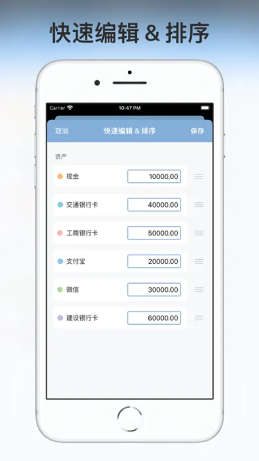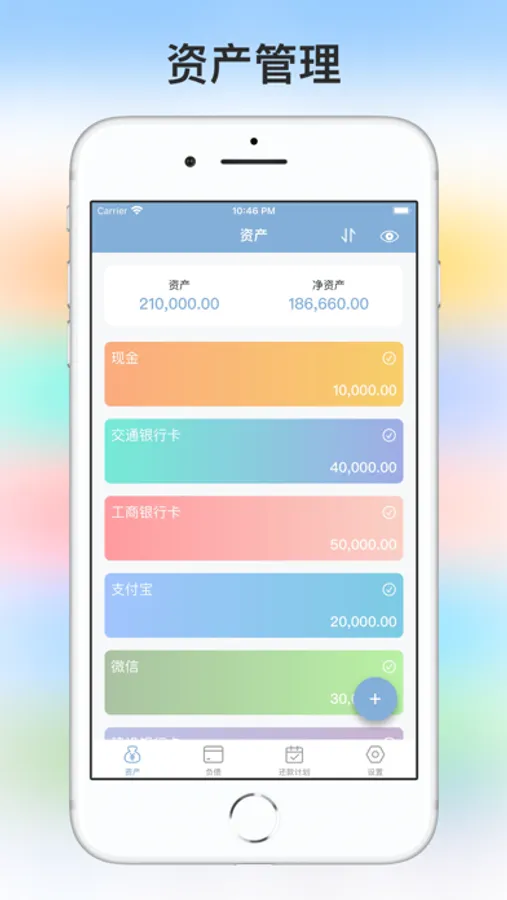 「资产管理」记录所有资产(如支付宝、微信钱包、储蓄卡)的账户余额,资产与净资产一目了然