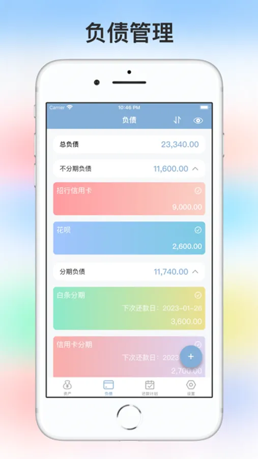 「负债管理」记录所有负债(如信用卡、分期贷款等)的负债记录