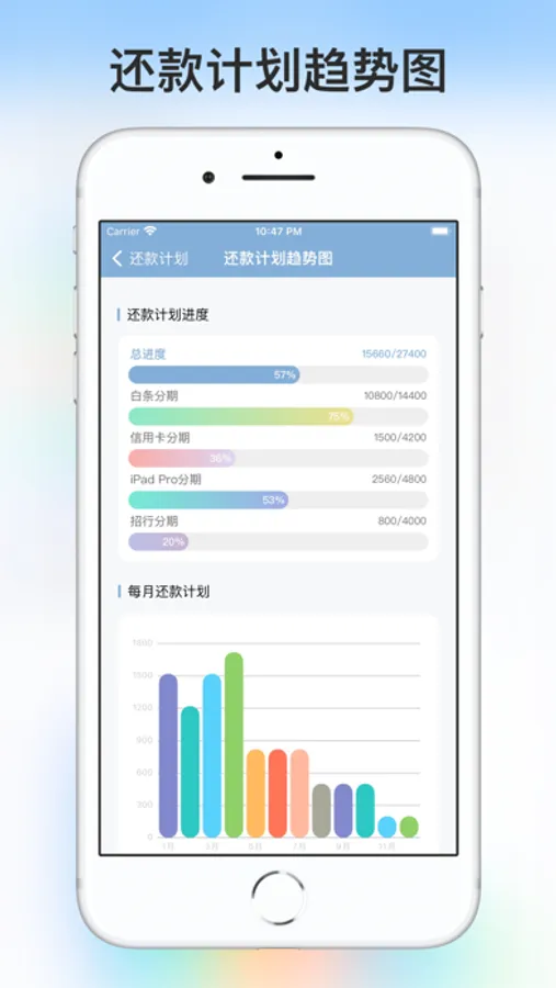 「还款图表」根据还款计划生成按月趋势图和总趋势图,剩余待还清晰展示