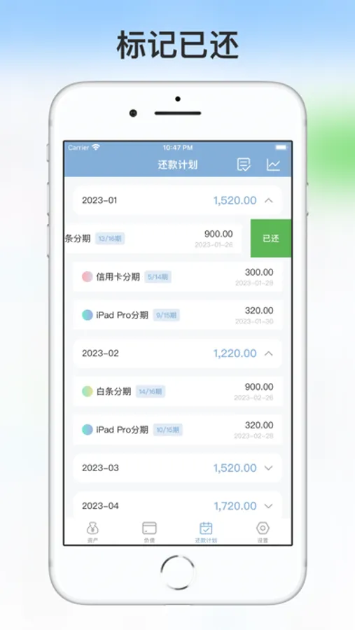 3、每月还款金额与计划清晰可见,轻松标记已还