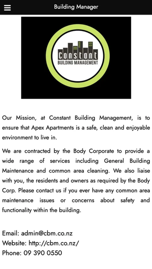 This free application designed by Constant Building Management provides everything you need to know about living at Apex Apartments, 22 Prosford Street. It has been designed to provide useful information about the building and as a convenient way of staying informed about the rules, events or changes happening in or around the complex.