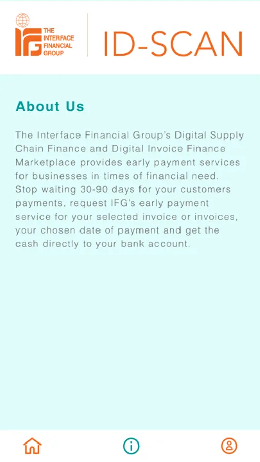 IFG's IDScan application using intelligent data capture technology for fast customer on-boarding and identity verification provides verification and identity fraud protection for our users of the IFG’s Universal Portal for our signature and signup. The Interface Financial Group provides a Universal Portal of financial services which include, Digital Invoice Finance, Dynamic Discounting, and Digital Supply chain Finance. The IFG IDScan application is used only for users who are signing up for these services.