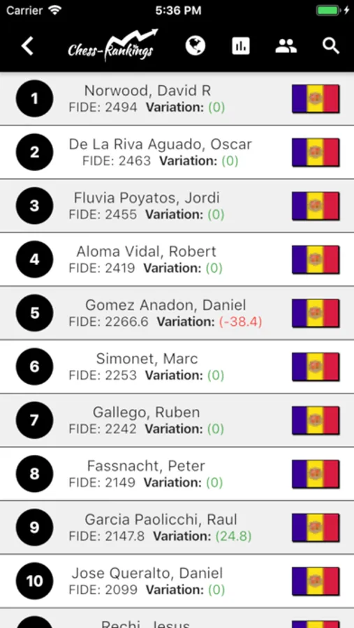 FIDE Chess Rankings and Ratings, statistics and live results. ELO variations. You should check your ELO variation just before and after a match with our ELO Calculator. Also you can download chess games in pgn format to be open with your favorite Chess Game Analyzer app.