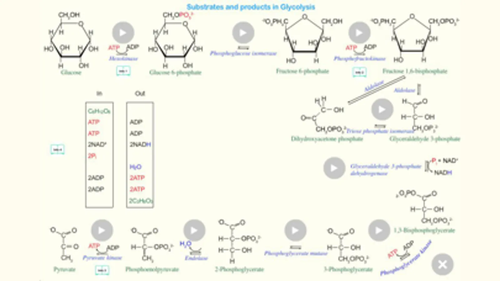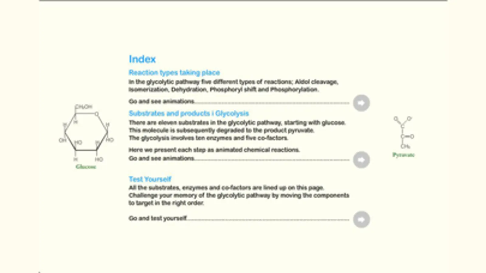 Get a detailed overview of the 10 steps in the glycolytic pathway. Each step in the glycolytic pathway is visualised by interactive play and replay animations, including all substrates and products, enzymes and co-factors. The net outcome of the reactions is summarized in a table.