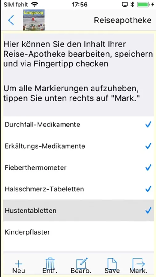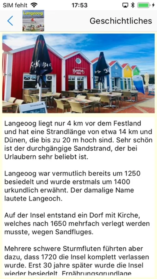 Die Langeoog App und enthält u.a. Reise-Checklisten für Ihre Reiseapotheke und Ihr Urlaubsgepäck, welche Sie auch selber verfeinern und im nächsten Urlaub wieder benutzen können. Außerdem bietet sie eine Reistagebuch und Wetterstatistiken mit schönen Diagrammen z.B. zum Klimavergleich zweier Urlaubsorte. Weiterhin ist eine kleine Diashow und eine Sammlung von relevanten Webseiten für die Region vorhanden und gibt Ihnen die Möglichkeit, alle Informationen, die für Ihren Aufenthalt auf Langeoog oder für Sie als Fan von Langeoog interessant sind, möglichst bequem im Internet abzurufen: