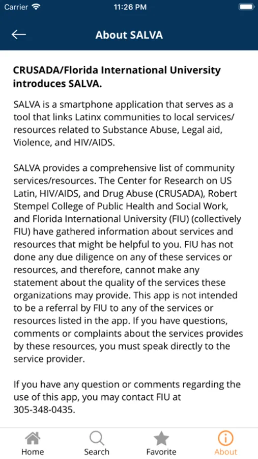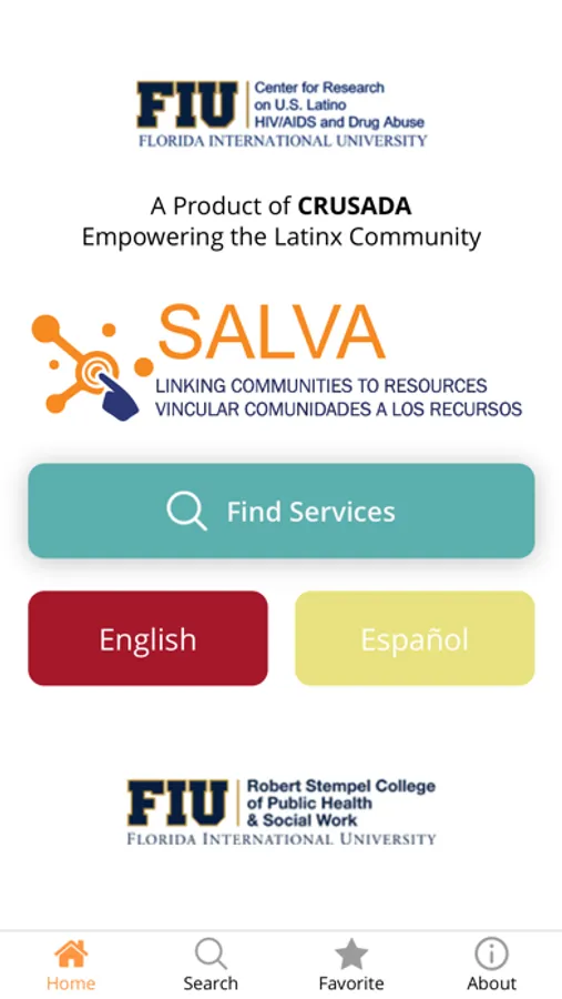 Developed by the Center for Research on US Latino, HIV/AIDS, & Drug Abuse (CRUSADA) at Florida International University (FIU) the SALVA application combines traditional solutions with a novel approach. Assisting underserved populations to receive the services they need. Traditionally such a task would require training community health workers to link hard-to-reach and underserved communities to local resources. However, by gathered information on many of the available community services and resources and placing it at the community’s fingertips, SALVA empowers the underserved population. SALVA provides information on local nonprofit and government agencies that provides substance abuse services, help to victims of violence, legal aid, HIV/AIDS testing and services, housing, financial help and training, educational programs, and more. SALVA is bilingual and informative and maintained by the CRUSADA at FIU.