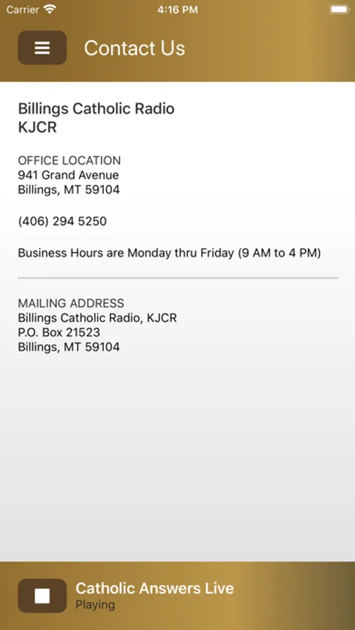 Billings Catholic Radio, KJCR is owned and operated by the board of directors or Agnus Dei Communications. Founded in 2007, Agnus Dei Communications was formed as a 501c3 non-profit whose mission is to use the power of radio to evangelize, educate, and inspire a faithful life in Christ. Our vision is to share the truth of Jesus Christ through the teachings of the Catholic faith. We broadcast the EWTN Global Catholic Radio Network as well as the Ave Maria Radio Network and promote many local Catholic events, including live broadcasts of the Billings Central High School Rams Athletics. We provide authentic Catholic teaching for all who seek Christ.