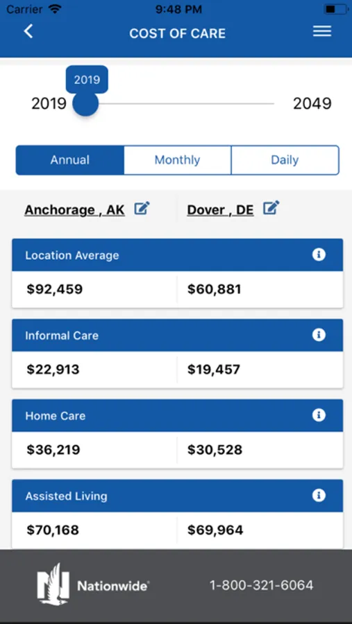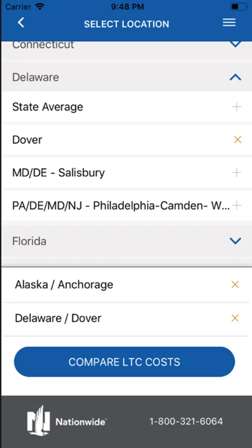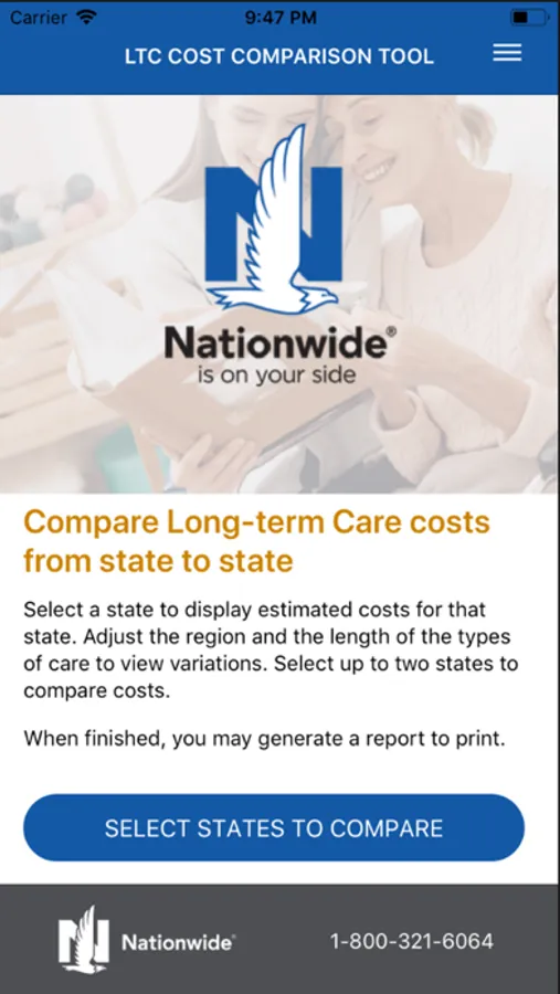Compare Long-term Care costs from state to state. Select a state and click on the details to display estimated costs for that state. Adjust the region and the length of the types of care to view variations. Select up to two states to compare costs. When finished, you may generate a PDF report.