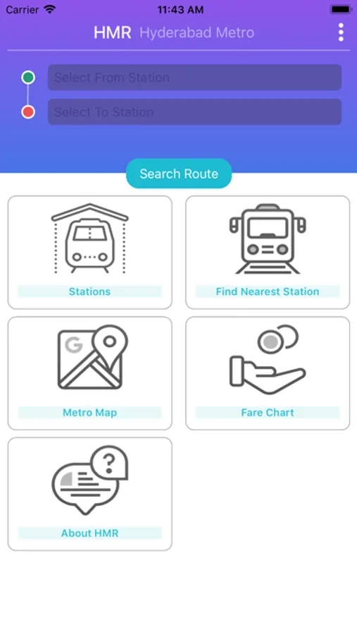 Hyderabad Metro (HMR) app is beautifully designed mobile app to make the transportation easy. Enter Source and Destination Station and find basic detail of the route like distance, fare, journey duration, number of stations, and interchange if any. Finding Hyderabad metro route and timing is now so easy to find.