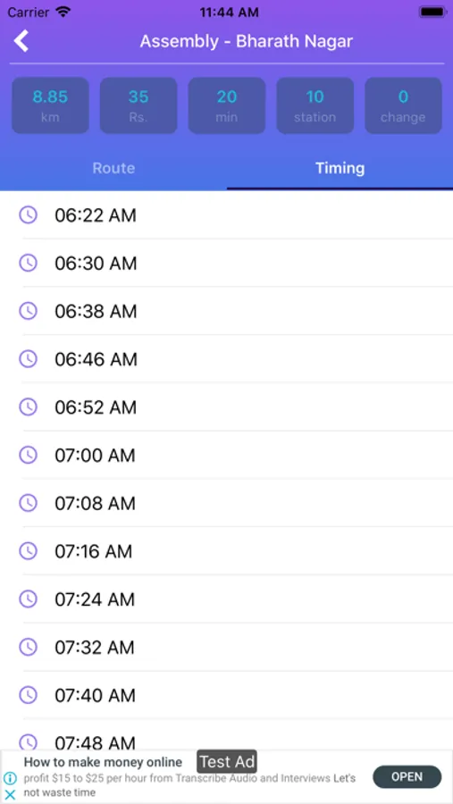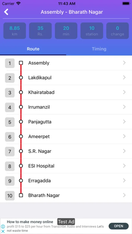 » Shows route and timing between two stations with information like total journey kilometres, fare, journey durations, total stations and changes if any between red and blue line.