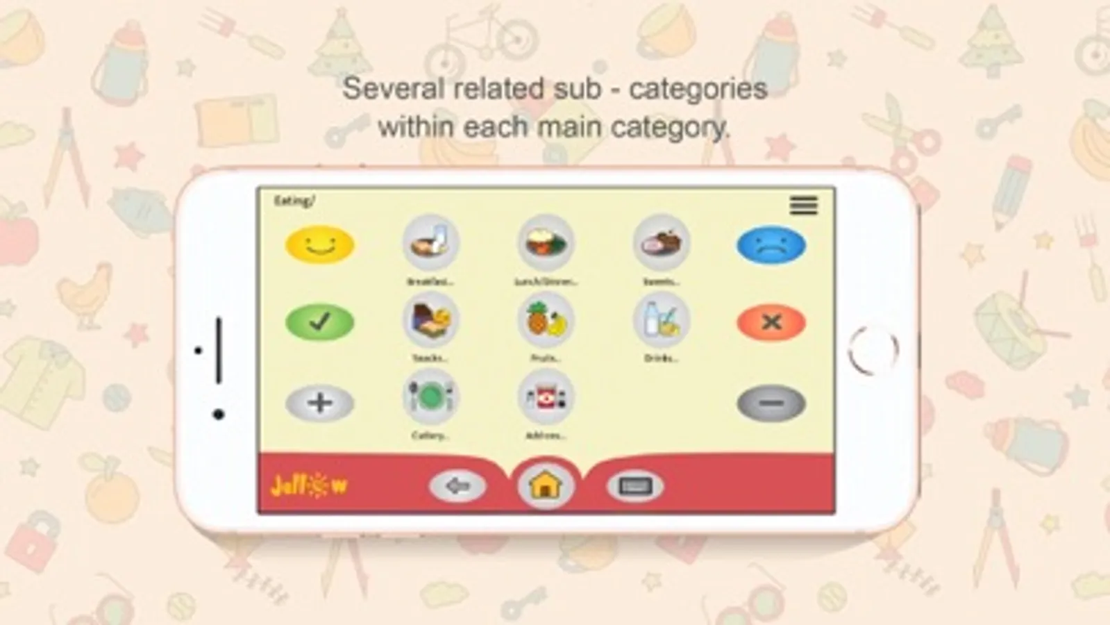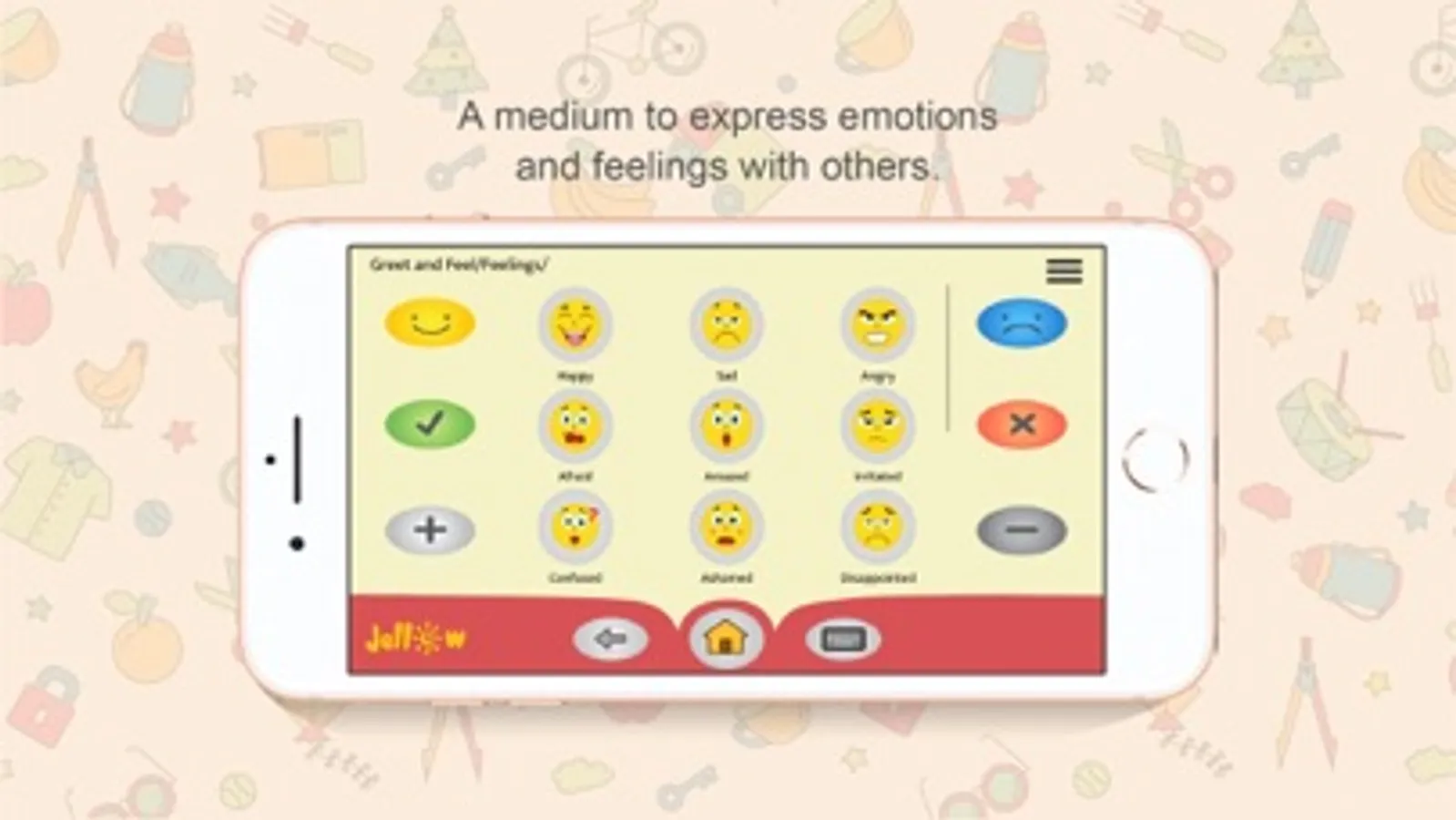 Jellow has a simple, visually appealing, and easy-to-learn interface consisting central 'category' buttons and 'expressive' side buttons. The content of the app is organized into basic category buttons that make it easy for the user to access and find desired icons. The user can make the app speak out sentences by simply clicking on any of the category buttons followed by any of the expressive buttons.