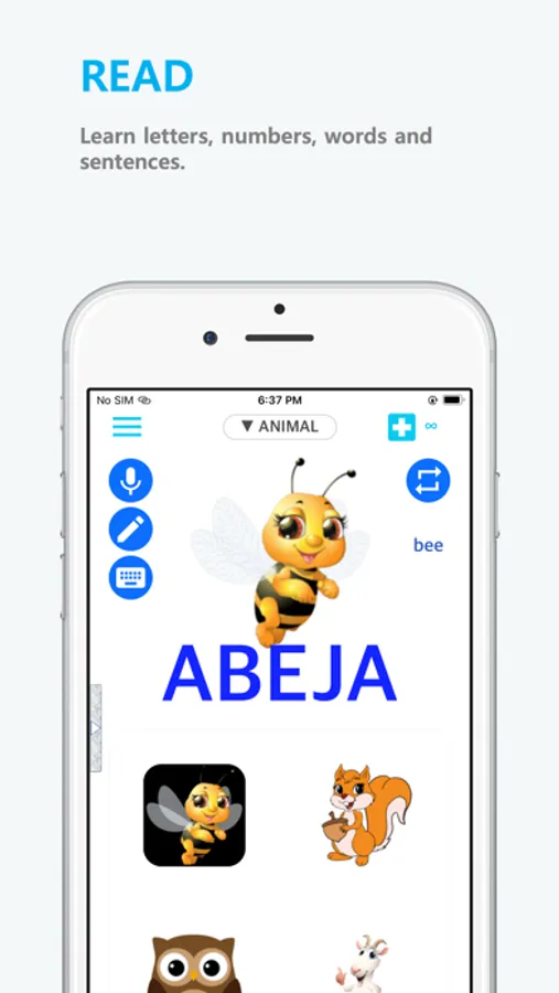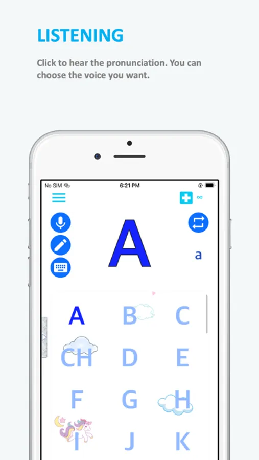 · When you press a word, letter, or number, the pronunciation of the selected learning language is heard.