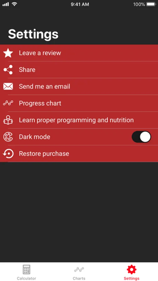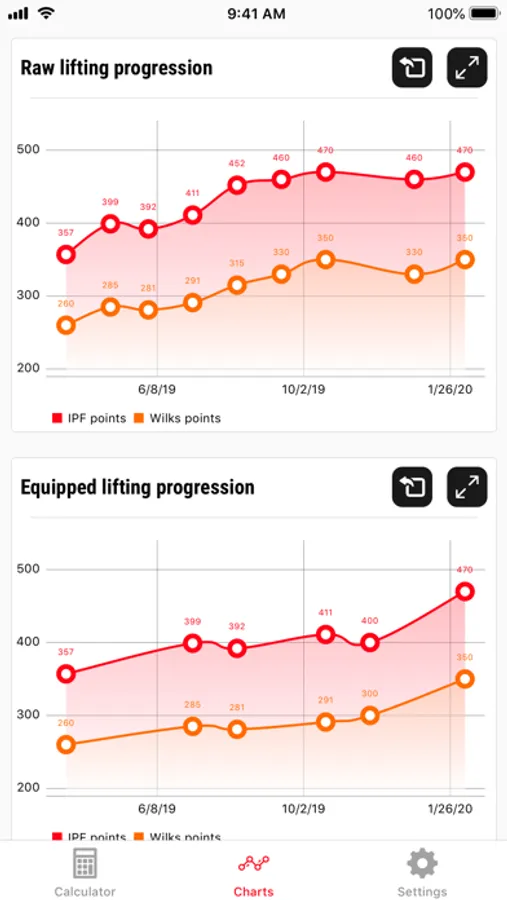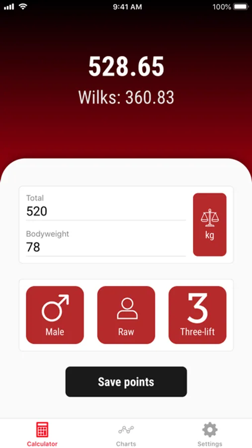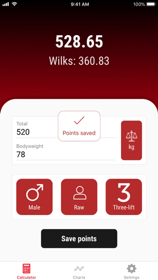 • In-app purchase option of charting tool to track your progress for raw and equipped powerlifting. Export your charts as screenshots or as CSV files.