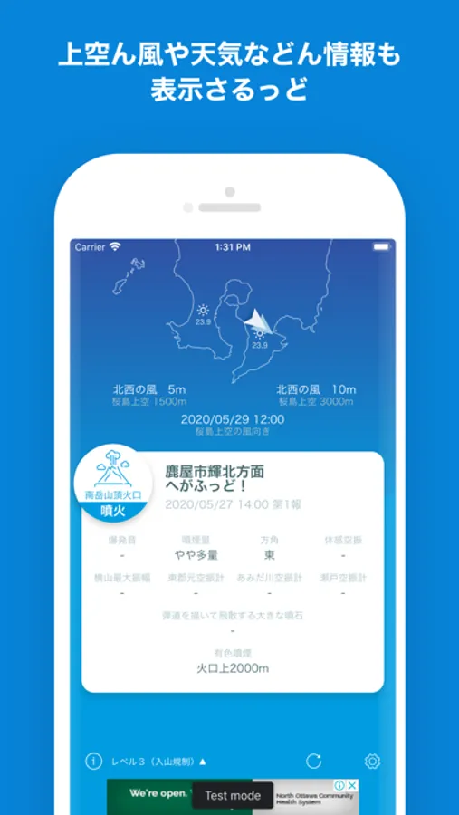 こんアプリは、桜島ん噴火や爆発によってどん方向にへが降っかを通知すっアプリじゃっど。