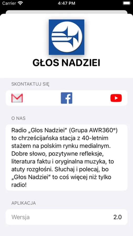 Radio „Glos Nadziei” (Grupa AWR360°) to chrześcijańska stacja z 40-letnim stażem na polskim rynku medialnym. Dobre słowo, pozytywne refleksje, literatura faktu i oryginalna muzyka, to atuty rozgłośni. Słuchaj i polecaj, bo „Głos Nadziei” to coś więcej niż tylko radio!