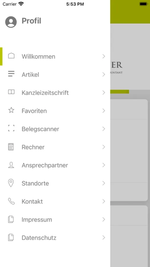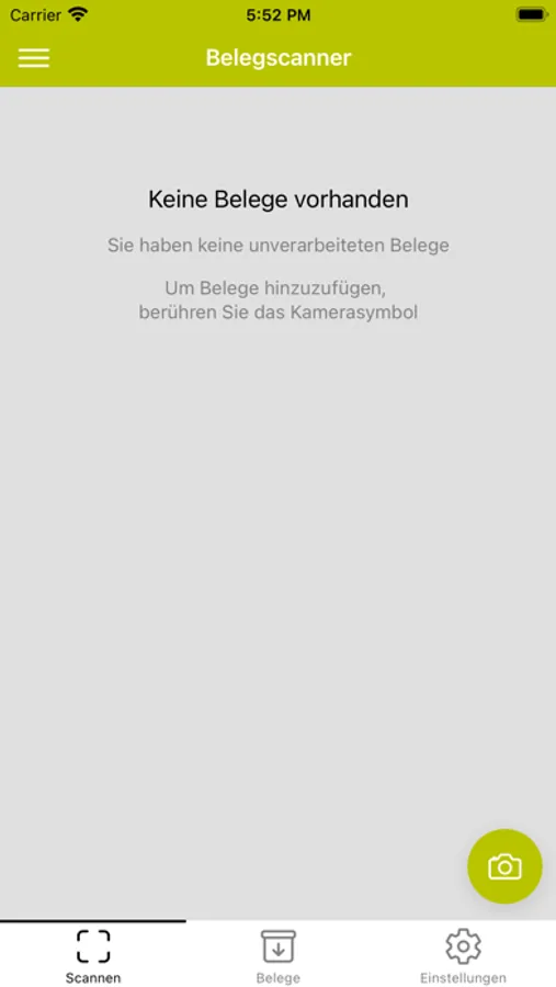 Hier können Sie mit der Kamera des Gerätes ein Foto von dem Beleg erstellen, das automatisch zugeschnitten und nachgebessert wird. Anschließend können Sie diesen Beleg verschlüsselt an unsere Kanzlei übertragen.