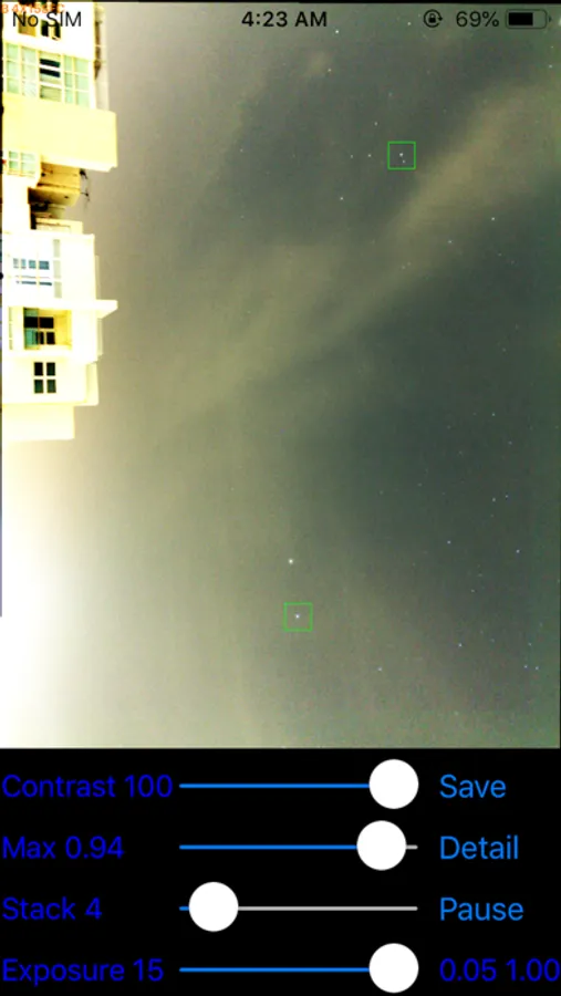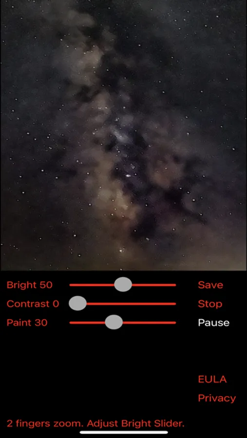 Paint - Slide to adjust paint size. During stacking, the stars will be aligned but the landscape will be blurred due to Earth rotation. Use your finger to paint over blurred landscape to sharpen the building, trees etc.
