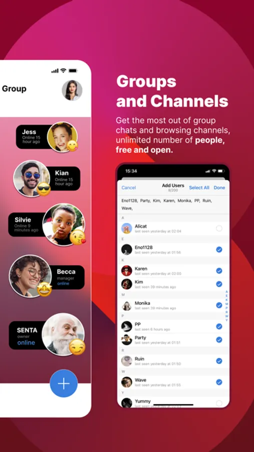 • You can create group chats for up to 100,000 members, share large videos, documents of any type, and even set up bots for specific tasks. It's the perfect tool for hosting online communities and coordinating teamwork.