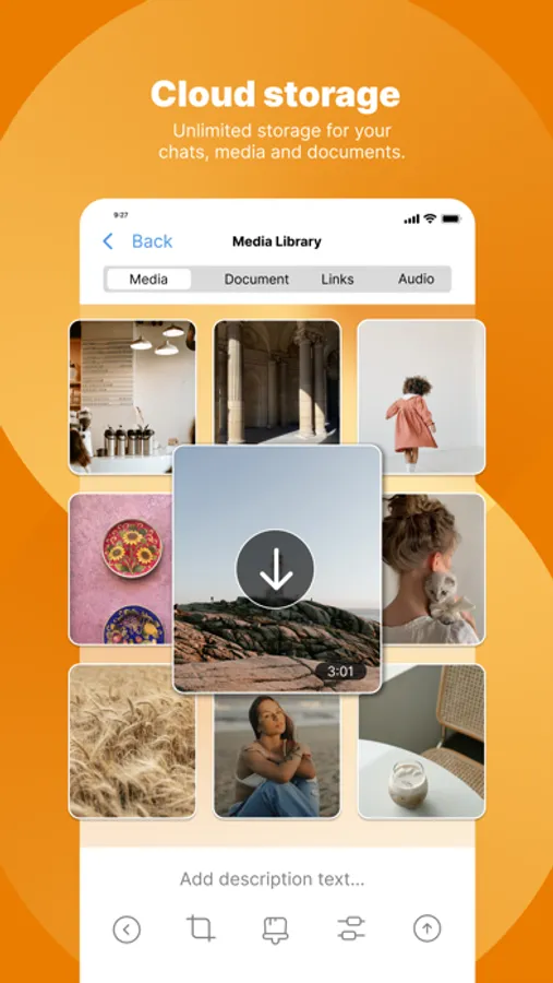 • You can send media and files, without any limits on their type and size. Your entire chat history will require no disk space on your device, and will be securely stored in the cloud for as long as you need it.