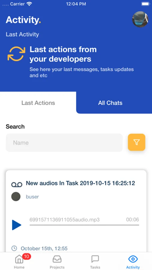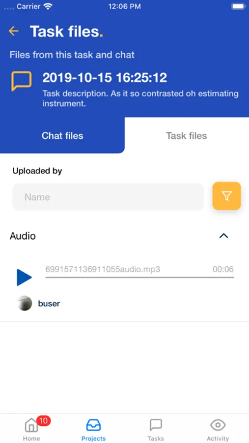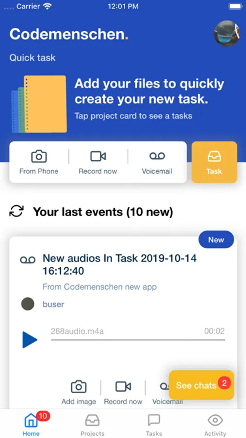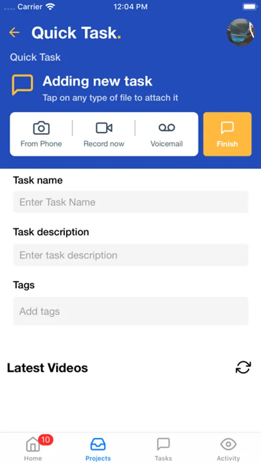 - Create tasks under the particular project with different information like Task name , Attachments with Screenshot , Screen Recording , Audio Recording , Set Task Priority , Image Selection.