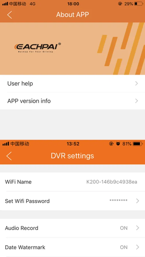 EACHPAI is an application for Full HD dash camera. With EACHPAI APP, you can connect to the dash camera to live view, playback, download and share the video/photo to social network.