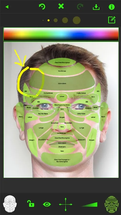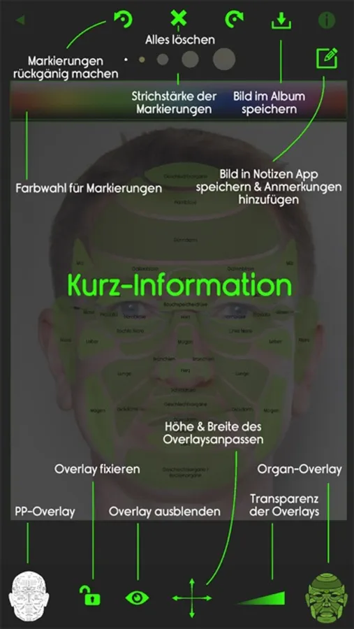 Über eine Zusatzfunktion können Bilder aus dem Album geladen oder Fotos von Gesichtern aufgenommen werden, in welchen dann besondere Merkmale markiert werden können. Zusätzlich kann die Frontalansicht der Psycho-Physiognomik und der Organe über das Gesicht gelegt werden. Ist die Analyse beendet, kann das Ergebnis entweder als Foto ins Album oder - um noch weitere Anmerkungen machen zu können - in die Notizen App gespeichert werden.
