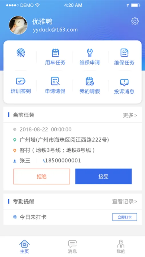 (2)考勤登记:驾驶员通过手机APP完成上下班考勤登记,查看考勤信息,包括考勤时间、考勤地点。
