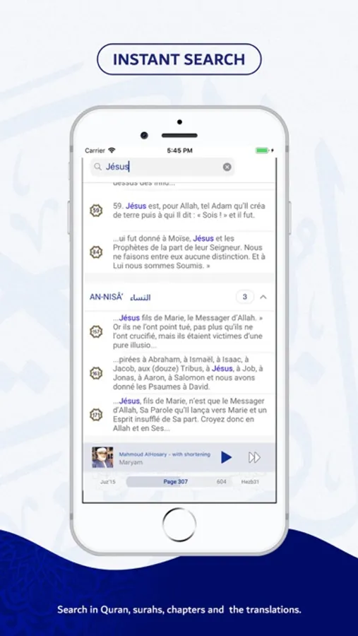 2- Instant Search: Search in Quran, surahs, chapters and the translations.