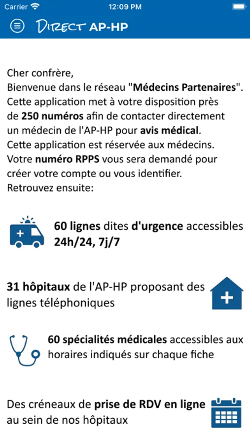 • D’accéder à une liste de numéros, assurant un contact direct avec un médecin senior de l’hôpital pour avis médical rapide, sur de nombreuses spécialités (plus de 20 hôpitaux référencés)