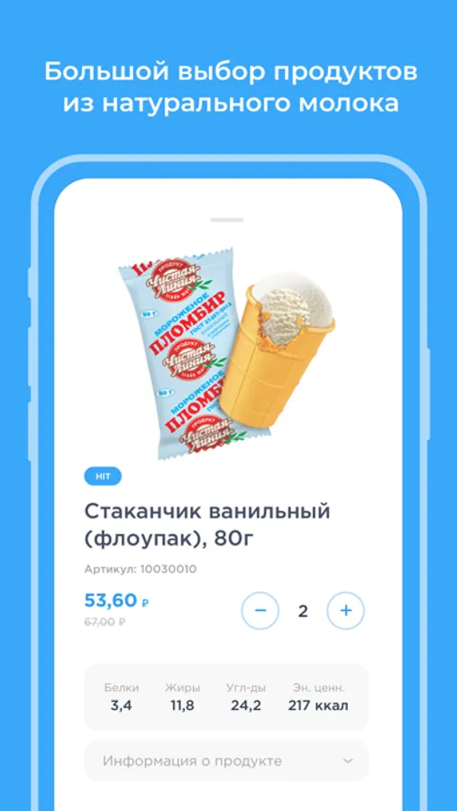 В приложении представлено более 100 видов мороженого, есть и такие, которые не всегда можно найти в розничных торговых точках. Молочная продукция короткого срока хранения продается только в интернет-магазине. Мы изготавливаем ее небольшими партиями в ночь, а утром доставляем всё самое свежее!