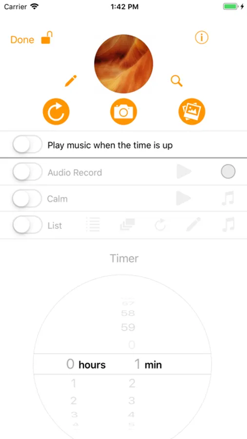 The app displays a predefined timer display and an audio play during or at the end of the timer's end