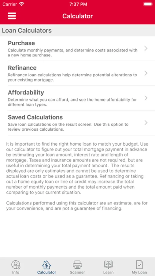 • Compare loan programs • Calculate the possible savings (or cost) of refinancing your current mortgage • Review homeownership options based on your current income and monthly expenses. • Ability to scan in required documents on your phone and upload them quickly to expedite the loan process • Easily access and contact your loan officer • Stay up-to-date on industry news and happenings that may impact your loan, like a change in mortgage interest rates