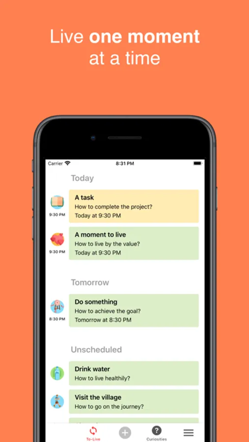 Write your big task as a curiosity, motivation will follow. Your life is indeed in your hand. Let your curiosity, along with To Live app, guides you to an intentional life.